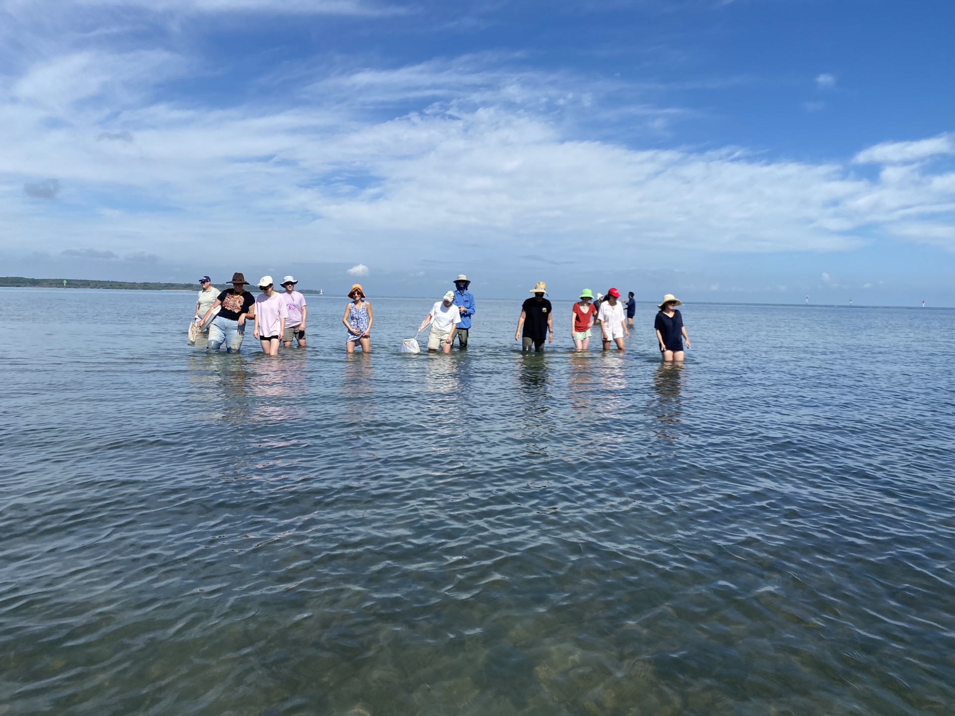 Participants at The Clam’s Kiss | Sogi a le faisua Summer Workshop (2022) wade through water on Quandamooka Country. Photo: Jacqueline Chlanda